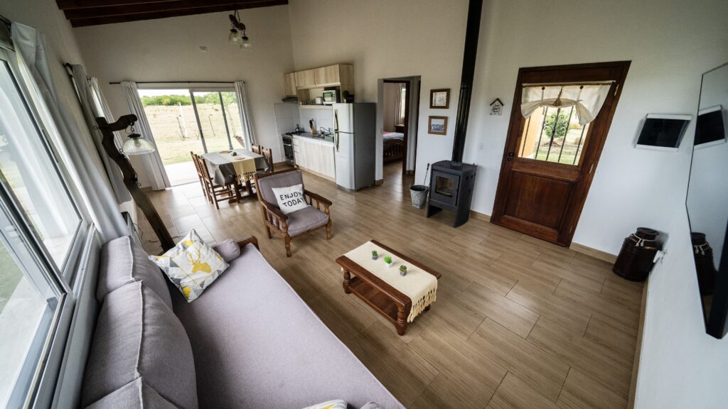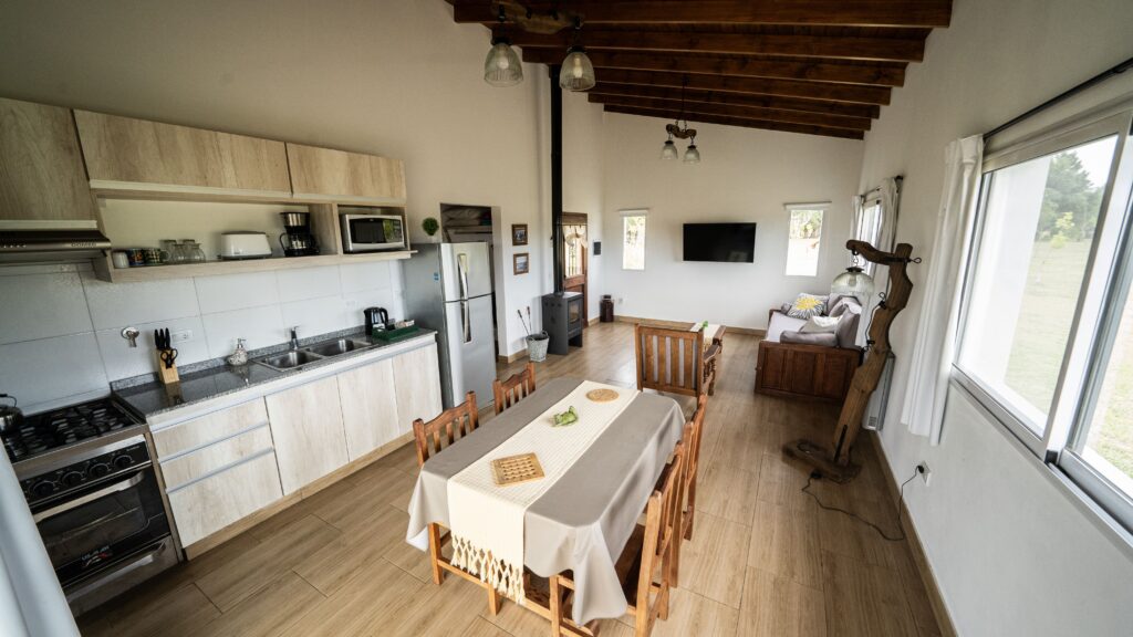 En Casa Brisa encontrarás una acogedora habitación con una cómoda cama matrimonial, asegurándote un descanso reparador. También contarás con un baño completo equipado con todas las comodidades necesarias. Nuestra cocina está totalmente equipada con modernos electrodomésticos, como microondas, cafetera, tostadora y pava eléctrica, para que puedas preparar tus comidas favoritas con facilidad. El amplio living comedor cuenta con un sofá cama y una segunda cama elevable en carrito, brindando espacio adicional y flexibilidad para acomodar a todos los huéspedes.