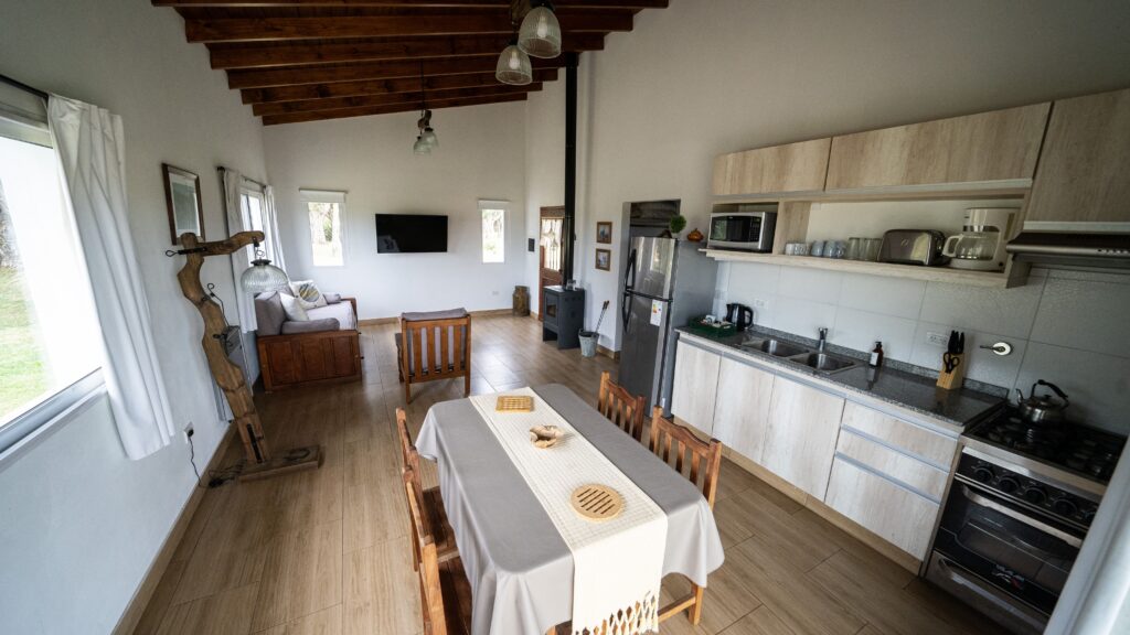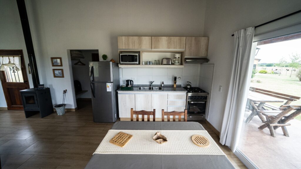 En Casa Terra encontrarás una acogedora habitación con una cómoda cama matrimonial, asegurándote un descanso reparador. También contarás con un baño completo equipado con todas las comodidades necesarias. Nuestra cocina está totalmente equipada con modernos electrodomésticos, como microondas, cafetera, tostadora y pava eléctrica, para que puedas preparar tus comidas favoritas con facilidad. El amplio living comedor cuenta con un sofá cama y una segunda cama elevable en carrito, brindando espacio adicional y flexibilidad para acomodar a todos los huéspedes.